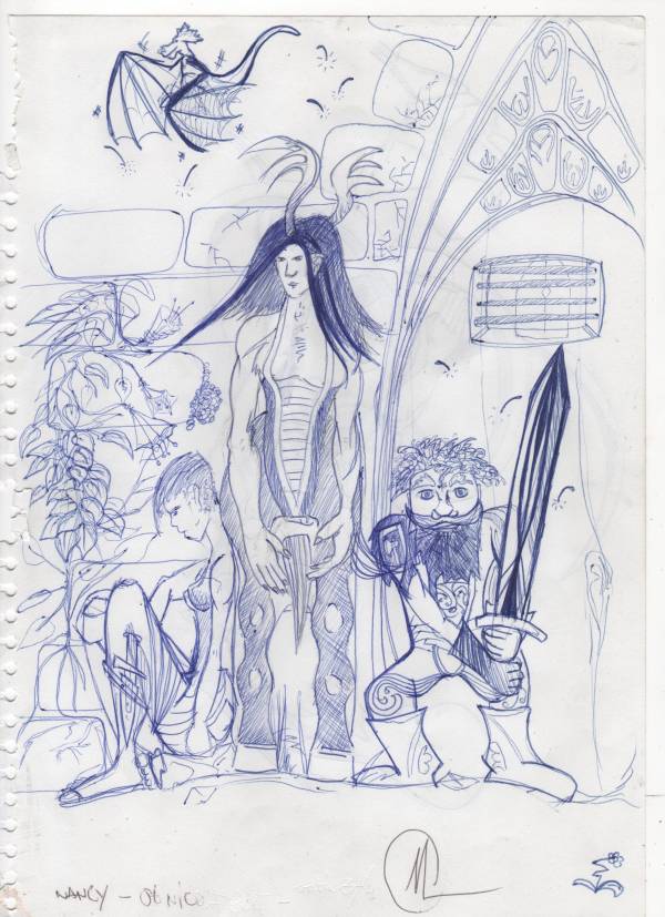 Le nain vous rétorque que vous ne pouvez être ami avec lui. Il s'énerve même d'un coup sec. Le centaure au bois de cerf souligne vos jambes du regard, alors que la femme aux oreilles pointues se ruine les yeux sur votre front plissé. En un seul mot, les trois compères vous disent : « Vous venez ? »